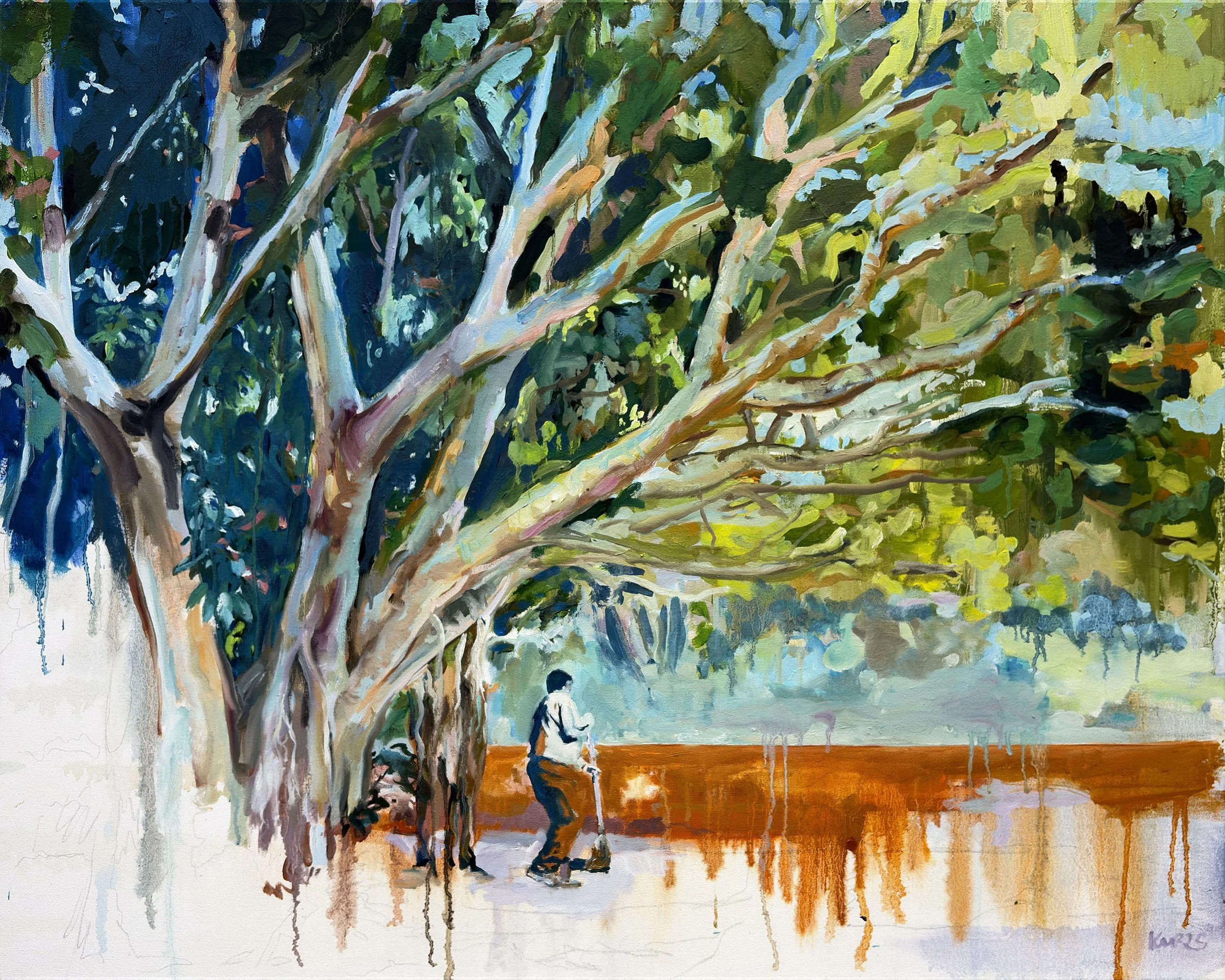 Shadows pour down the palms. In the midday sun, whatever wears no cap remains invisible.